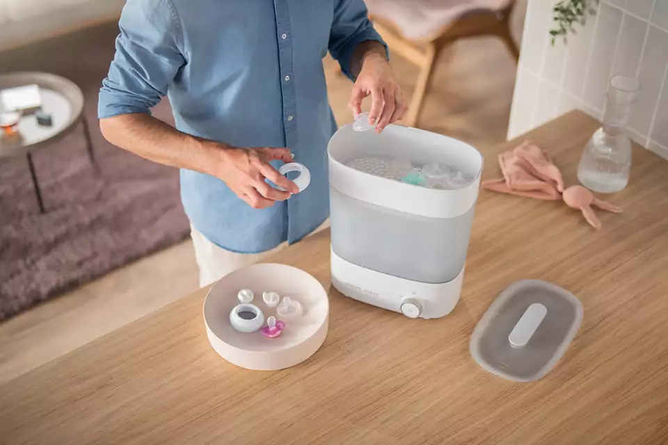 Mūsu augstas klases elektriskais sterilizators paveic vairāk, nekā tikai notīra pudelītes un iznīcina mikrobus, — tas žāvē un glabā pudelītes un piederumus, nodrošinot to sterilitāti līdz 24 stundām.