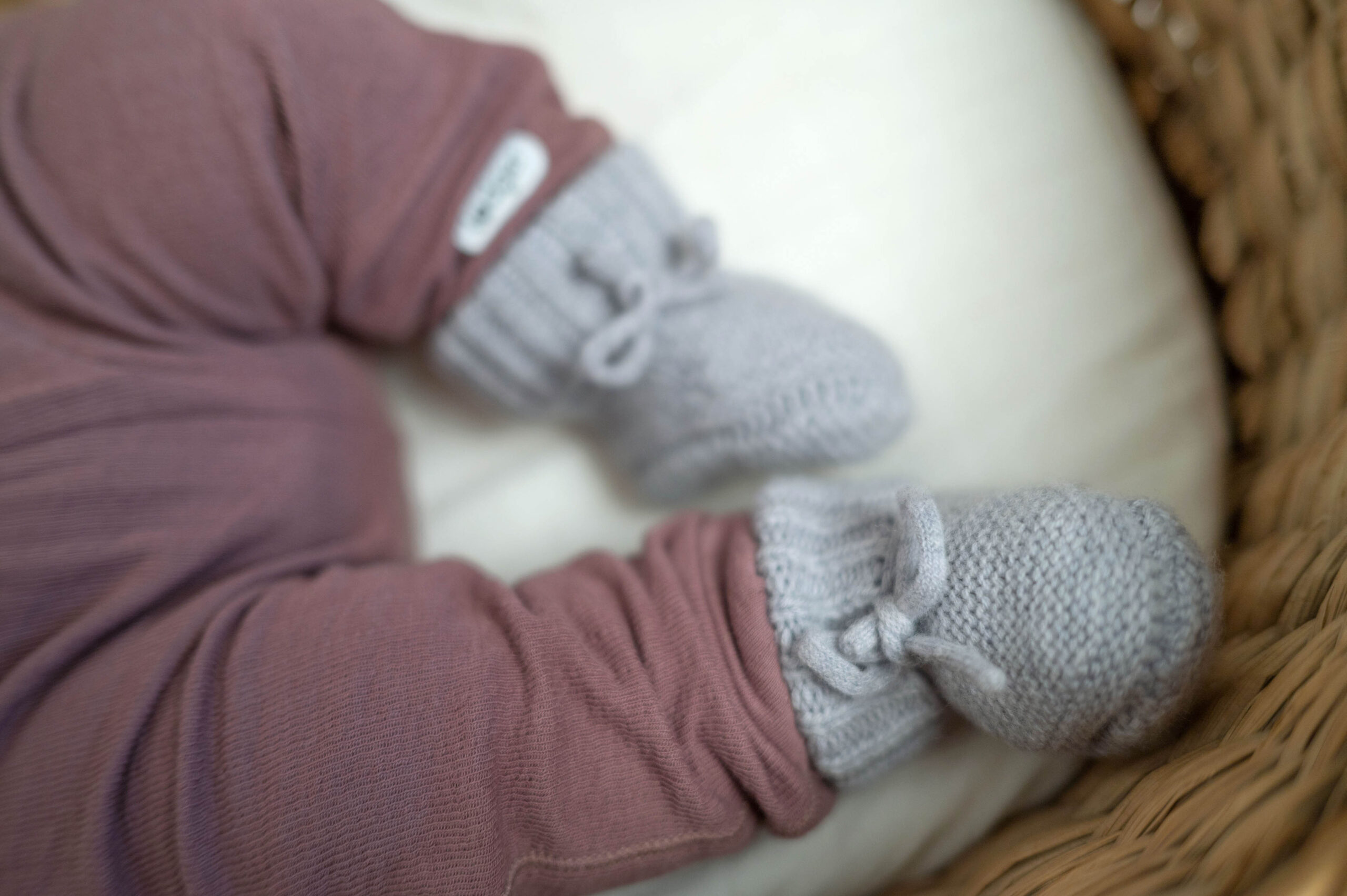 Šīs vilnas čībiņas, kas izgatavotas no 100% Merino vilnas, ir modernas. Mūsu vilnas čībiņas ir lietojamas visu gadu, pateicoties siltumu regulējošai kvalitātei. Tās nodrošina ne tikai siltas kājas, bet ir arī ļoti ērtas, pateicoties vilnai, kas neizraisa niezi. Pateicoties jaukai aukliņai tās labi pieguļ mazuļa kājiņai.
